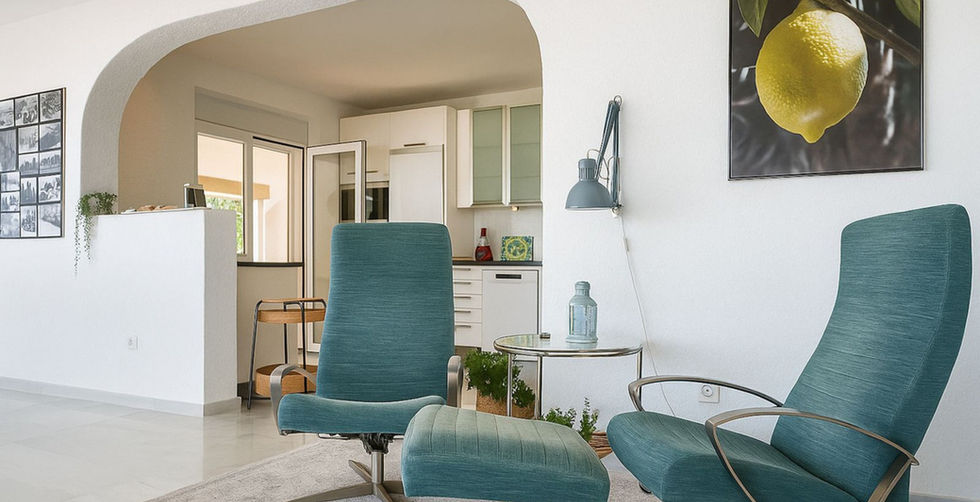 The spacious, open-plan living area connects effortlessly to a fully equipped modern kitchen and a covered terrace—perfect for relaxing, entertaining, or enjoying meals with family and friends.